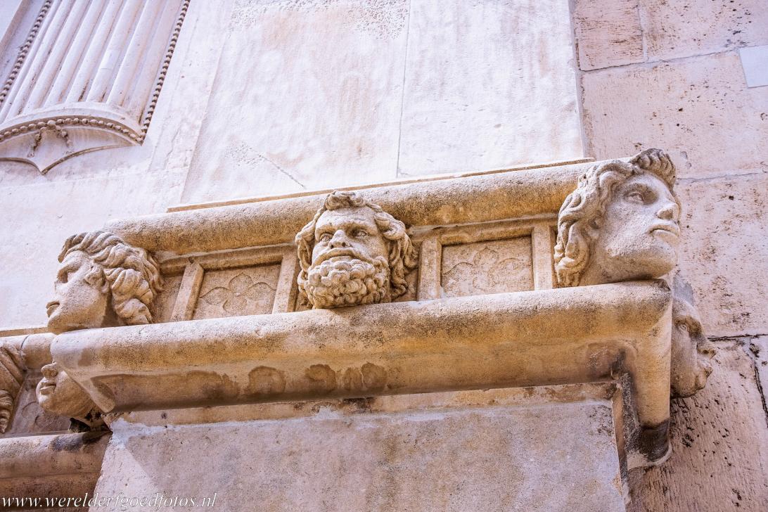 Een detail van het gebeeldhouwde hoofdportaal van de St. Jacobuskathedraal in Šibenik. De kathedraal is een unieke mix van de gotische- en renaissancestijl. De Italiaan Nikola Firentinac was een van de belangrijkste bouwmeesters van de St. Jacobuskathedraal. Na de dood van Juraj Dalmatinac, een Kroatische meesterbouwer, nam Firentinac het project over. Onder zijn leiding werd het beroemde stenen dak van de kathedraal is voltooid.