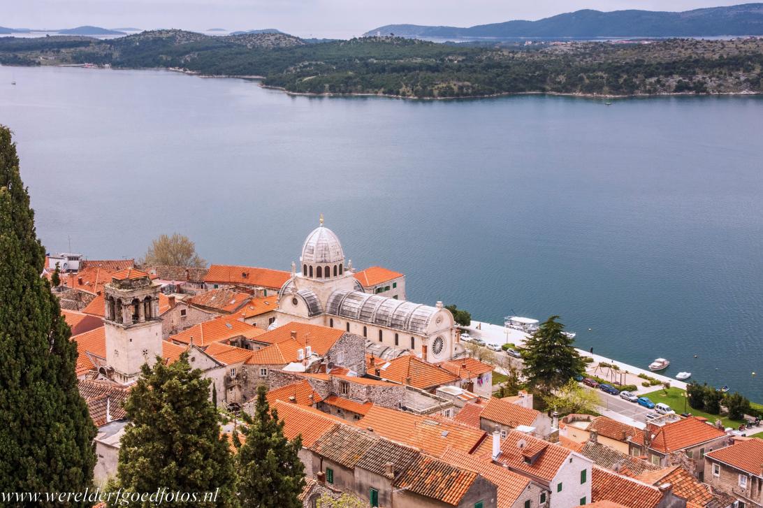 De St. Jacobuskathedraal van Šibenik gezien vanaf het kasteel van Šibenik. Vanaf dit punt is de bijzondere constructie van het dak goed te zien. De kathedraal heeft geen eigen klokkentoren, maar een toren op de stadsmuren dient als klokkentoren. De St. Jacobuskathedraal in Šibenik werd in 2000 een Werelderfgoed en staat ingeschreven op de Werelderfgoedlijst van UNESCO als: Cathedral of St. James in Šibenik.