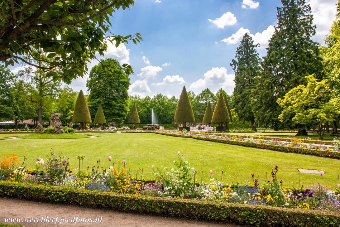 Residentie van Würzburg: Een deel van de barokke hoftuinen aan de oostkant, de Ostgarten, op de achtergrond de imposante residentie. De residentie werd gebouwd in opdracht van de prins-bisschoppen Johann Philipp Franz en Friedrich Carl von Schonbörn. De bouw begon in 1720 en duurde ruim 24 jaar, daarna werd er bijna 40 jaar gewerkt om het interieur van de residentie te decoreren, de residentie werd gebouwd onder toezicht van de hofarchitect Balthasar Neumann.