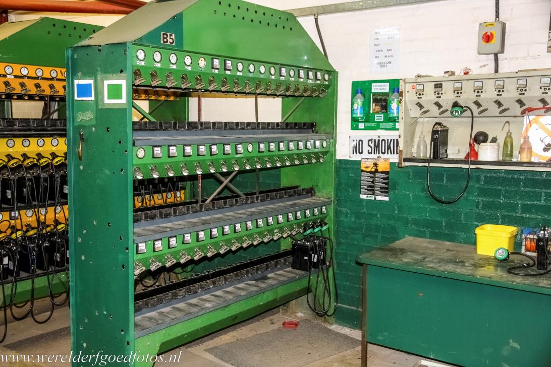 Industrieel landschap Blaenavon: De moderne ruimte, waar de mijnlampen werden opgeslagen. Iedere mijnwerker had een eigen identificatienummer, dat op zijn mijnwerkerslamp gegraveerd stond, dit nummer kwam overeen met de plaats van zijn lamp op het lampenrek, zo was het na een werkdag in de Big Pit meteen duidelijk of elke mijnwerker weer veilig boven de grond was.