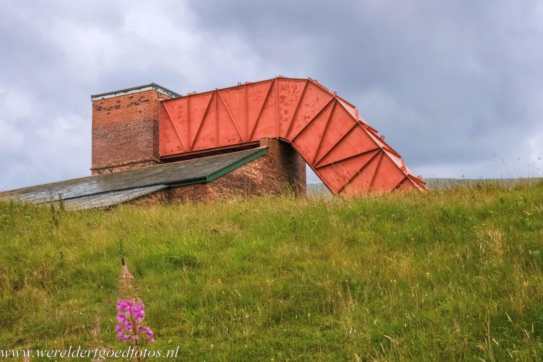 Industrieel landschap Blaenavon: Het luchttoevoer en afvoerkanaal van de steenkoolmijn de Big Pit. Enorme ventilatoren werden gebruikt om de lucht in de mijn te verversen, de bladen van de ventilatoren hadden een doorsnede van drie meter. De grote ventilatoren werden aangedreven door een elektromotor. De elektromotor kan bezichtigd worden in het machinehuis.