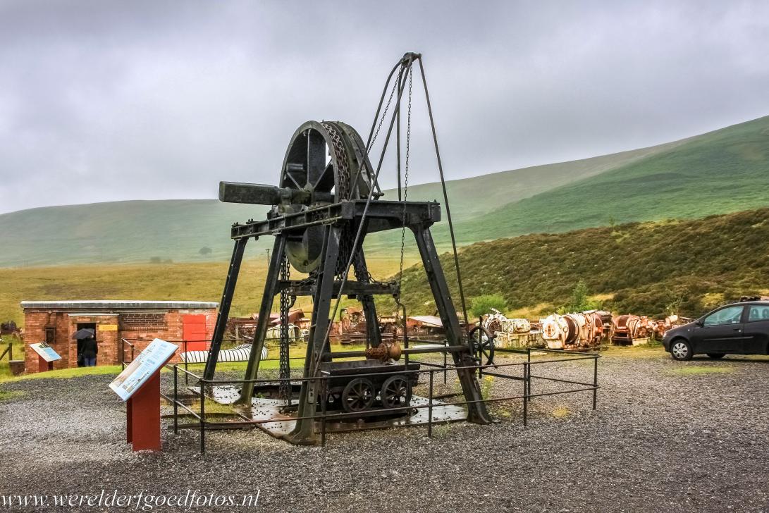 Industrieel landschap Blaenavon: Een 19de eeuwse takeltoren bij de Big Pit, het takelwiel werd aangedreven door waterkracht. In die tijd bestonden er meerdere soorten takeltechnieken, die werden aangedreven door mankracht, paardenkracht, stoomkracht of waterkracht. Industrieel landschap Blaenavon werd in 2000 uitgeroepen tot een Werelderfgoed van UNESCO.
