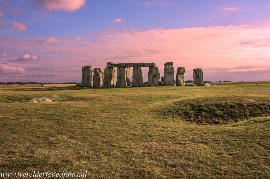 Stonehenge, Avebury en bijbehorende plaatsen: Stonehenge is het bekendste megalithische monument ter wereld. Stonehenge ligt in Groot-Brittannië, op de Salisbury Plain in de Engelse graafschap Wiltshire. Stonehenge bestond uit een buitencirkel van 30 staande stenen, de zgn. 'Sarsen Circle'. Binnen de 'Sarsen Circle' stonden de 5 'Sarsen Trilithons', elke trilithon bestond uit twee staande stenen en een liggende deksteen, de dekstenen werden op de staande stenen vastgezet met pen- en gatverbindingen. De binnencirkel bestond uit 60 staande stenen, de zgn. 'Bluestone Circle'. De stenen van Stonehenge zijn circa 2,5 m breed en 4 tot ruim 8 m hoog. De stenen van Stonehenge wegen 4 tot 45 ton per stuk. Rond de stenen cirkels ligt een krans van 56 kuilen, de 'Aubrey-holes', genoemd naar de ontdekker van deze kuilen. Rond het geheel liggen een aarden ringwal uit circa 3000 v.Chr. en een droge gracht. Tijdens de bouw waren 600 man nodig om één steen te verplaatsen. Tijdens de bouw was de as van Stonehenge gericht op zonsopkomst op de langste dag van het jaar. De astronomische en religieuze betekenis van Stonehenge wordt nog altijd onderzocht. Er zijn overeenkomsten met de stand van de zon en maan, tegenwoordig wordt verondersteld, dat Stonehenge werd gebouwd als astronomisch observatorium voor het markeren van de zomer- en winter zonnewende. In de loop der eeuwen zijn veel stenen van Stonehenge omgevallen of zelfs verdwenen, maar Stonehenge is nog altijd erg indrukwekkend. Stonehenge, Avebury en bijbehorende plaatsen, waaronder Silbury Hill en West Kennet Avenue, werden in 1986 uitgeroepen tot Werelderfgoed, ze werden ingeschreven op de Werelderfgoedlijst van UNESCO als: Stonehenge, Avebury and Associated Sites. Beeldend werk uit de serie Werelderfgoed: Mysterious Stonehenge en Stonehenge en Stone Circle