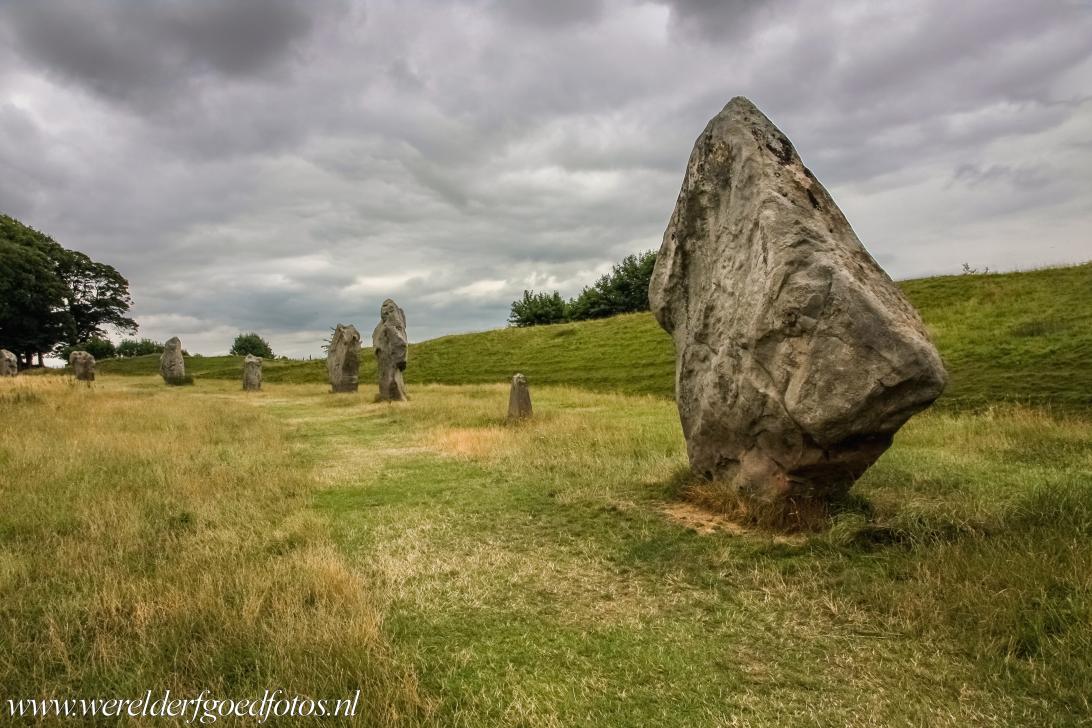 Stenen cirkels en henge van Avebury: Een deel van de grootste stenen cirkel, erachter de droge sloot en de aarden wal, de Avebury Henge. De drie stenen cirkels van Avebury worden omgeven door de henge. De grond uit de sloot werd gebruikt voor de wal. Er zijn vier ingangen in de wal, zeker is dat drie van deze ingangen de oorspronkelijke ingangen waren, van een vierde ingang aan de oostkant is dit niet zeker, maar is waarschijnlijk ook orgineel.