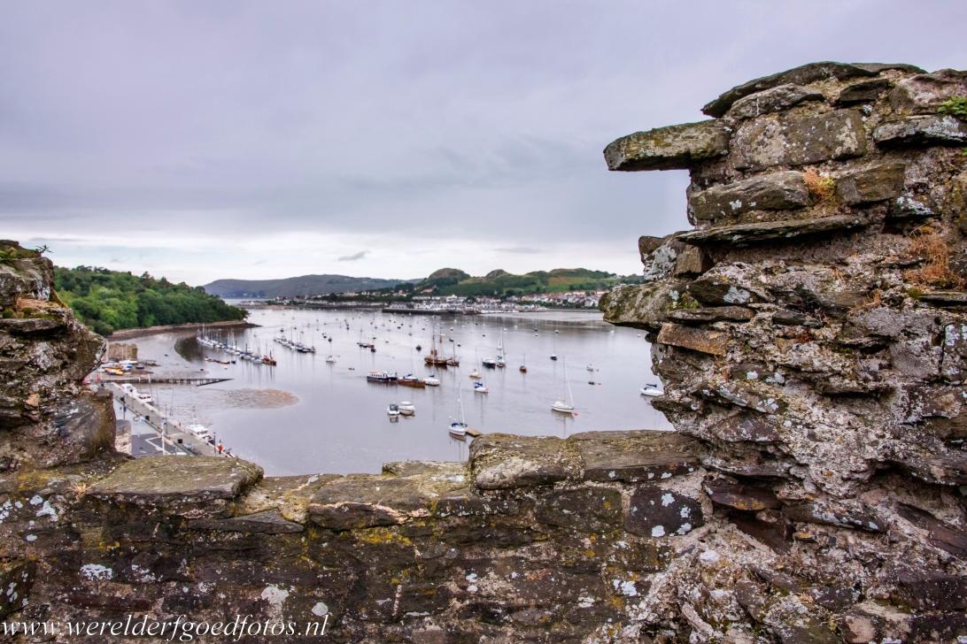 Kastelen en stadsmuren van King Edward in Gwynedd: De haven van de stad Conwy gezien door een kijkgat in de stadsmuren. De muren werden gebouwd tussen 1283 en 1287, bijna gelijktijdig met het kasteel van Conwy. De kastelen en stadsmuren van koning Edward in Gwynedd zijn een uitmunted voorbeeld van militaire bouwkunde uit die tijd.