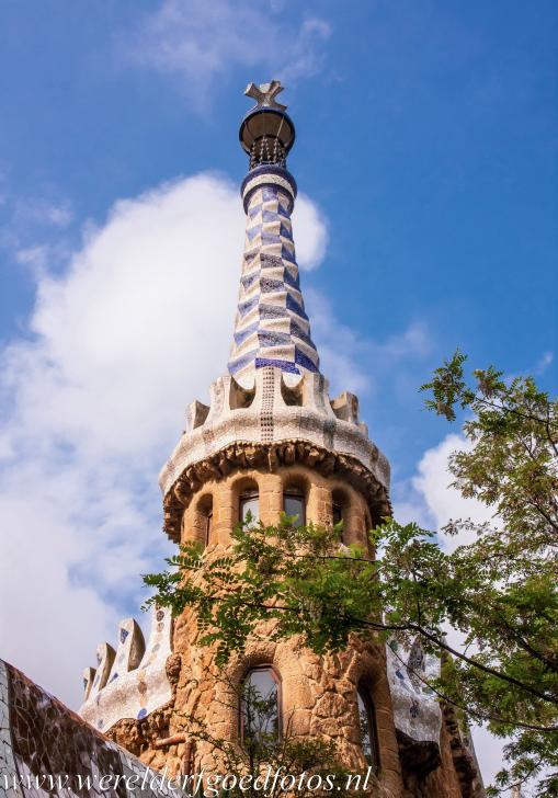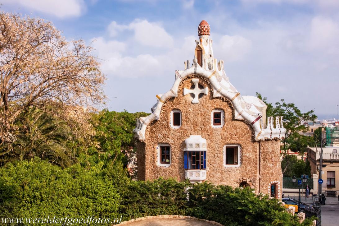 Werk van Antoni Gaudí, Barcelona: Een van de gedecoreerde gebouwen in Park Güell. De gebouwen zijn gedecoreerd met mozaïeken, gemaakt van scherven en gebroken keramiek. De meeste werken van Antoni Gaudí werden gebouwd in Barcelona of in de omgeving van de stad. De werken van Antoni Gaudí zijn wereldberoemd. Park Güell hoort bij het Werelderfgoed van UNESCO: Works of Antoni Gaudí, Barcelona.