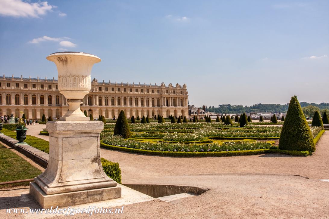 Paleis en park van Versailles: Het paleis van Versailles gezien vanuit de Franse tuinen. De tuinen dienden als voorbeeld voor veel tuinen elders ter wereld. Veel Europese vorsten gebruikten de tuinen van Versailles als voorbeeld voor de aanleg van hun eigen paleistuinen. Aan het eind van de 16de eeuw ontstond de barokke tuinstijl in Italië en verspreidde zich naar Frankrijk, waar het bekend werd als de Franse tuinstijl, de Jardin à la Française.