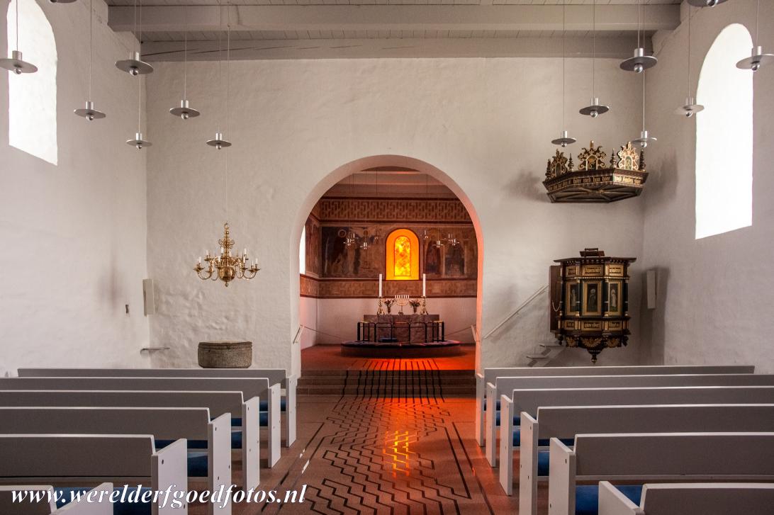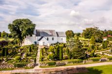Grafheuvels van Jelling, runenstenen en kerk: Nadat Koning Harald Blauwtand (ca.930-986) van Denemarken het christendom had aangenomen, bouwde hij op deze plek in Jelling een houten kerk als mausoleum voor zijn vader Gorm de Oude, de Deense Vikingkoning. De huidige stenen kerk is een romaanse kerk, ze werd gebouwd in 1100.