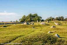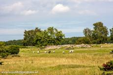 Agrarisch landschap van Zuid-Öland: Grazende schapen op een grafveld uit de ijzertijd op de Stora Alvaret, de Grote Alvar. Op de Stora Alvaret liggen meerdere grafvelden uit de bronstijd en ijzertijd, zoals Gettlinge, Mysinge en Frösslunda. Vogels en zeldzame insecten bevolken de Stora Alvaret. Grazende schapen creëerden gunstige omstandigheden voor zeldzame plantensoorten zoals het Ölandse zonneroosje, een van de soorten die Carl Linnaeus hier in 1741 ontdekte.