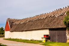 Agrarisch landschap van Zuid-Öland: Een Gautische boerderij nabij Borgs Angar en de kapel van St. Knut, en de iets verderop gelegen ruïne van Fort Gråborg, het grootste ronde prehistorische fort in Zweden. De Gautische boerderijen op Öland hebben een met stro of riet gedekt dak met een kenmerkende nok. Dit soort daken werd veel gebruikt in het zuiden van Zweden op schuren en boerderijen. De Gauten waren een Germaans volk dat in het zuiden van Zweden woonde.