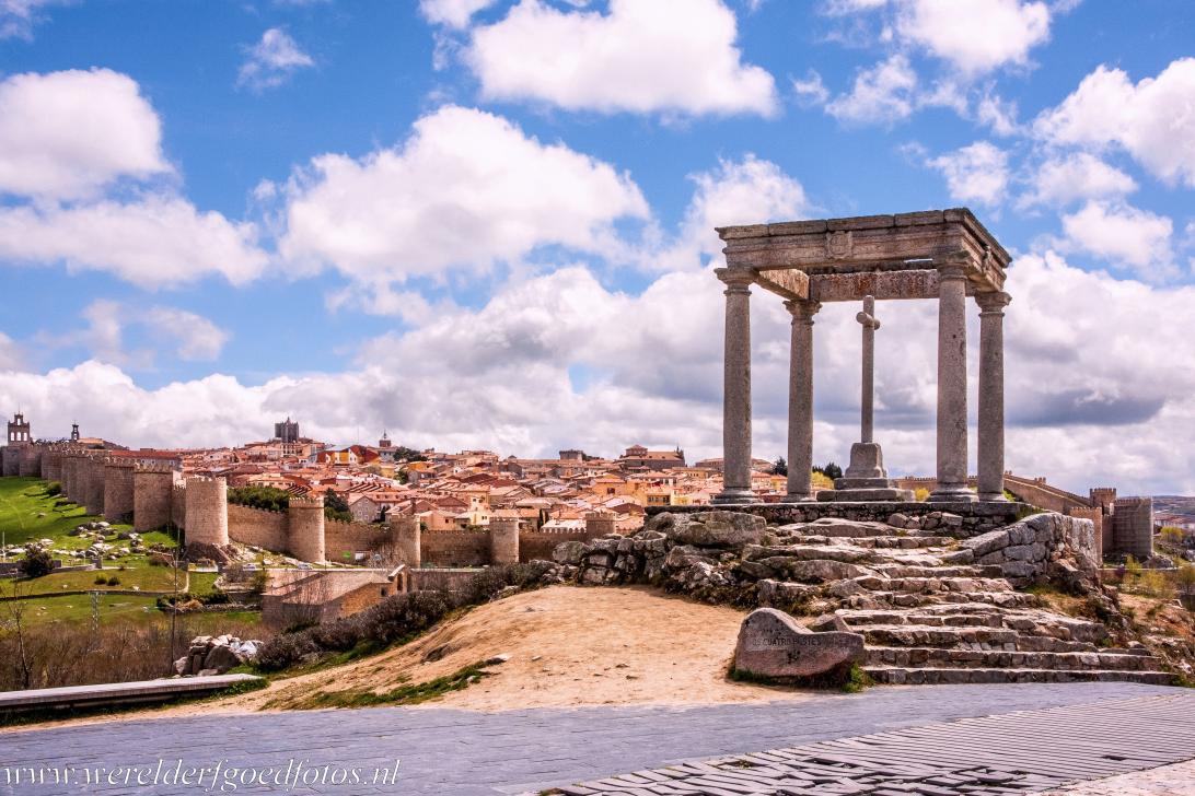 Oude stad van Ávila met de kerken buiten de muren: Het monument de Los Cuatro Postes, de Vier Zuilen. Het monument ligt op een heuvel net buiten Ávila. Vanaf de Los Cuatro Postes heb je goed uitzicht op de volledig ommuurde Oude stad van Ávila. Over het historische monument gaan enkele legenden, die vaak te maken hebben met Theresia van Ávila, een vooraanstaande Spaanse mystica, schrijfster, hervormster en een non, die in 1515 werd geboren in Ávila.