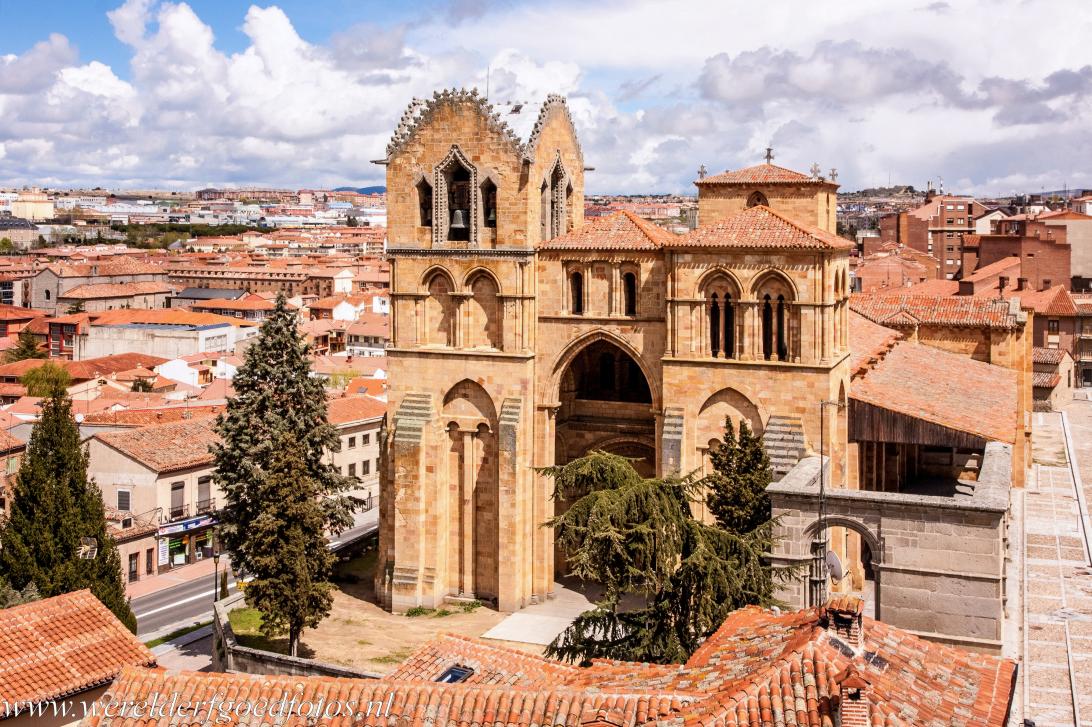 Oude stad van Ávila met de kerken buiten de muren: De Basilica de San Vicente, de Basiliek van de Heilige Vicente, gezien vanaf de stadsmuren van de Oude stad van Ávila. De basiliek werd in de 12de eeuw in de romaanse stijl gebouwd. De Basilica de San Vicente is een van de kerken die buiten de muren van Ávila werd gebouwd, ze staat op de plek, waar San Vicente werd gedood tijdens het bewind van de Romeinse keizer Diocletianus. In de kerk is het graf van San Vicente. In de crypte staat een rots, dit zou de de plek zijn, waar San Vicente werd gemarteld en gedood.