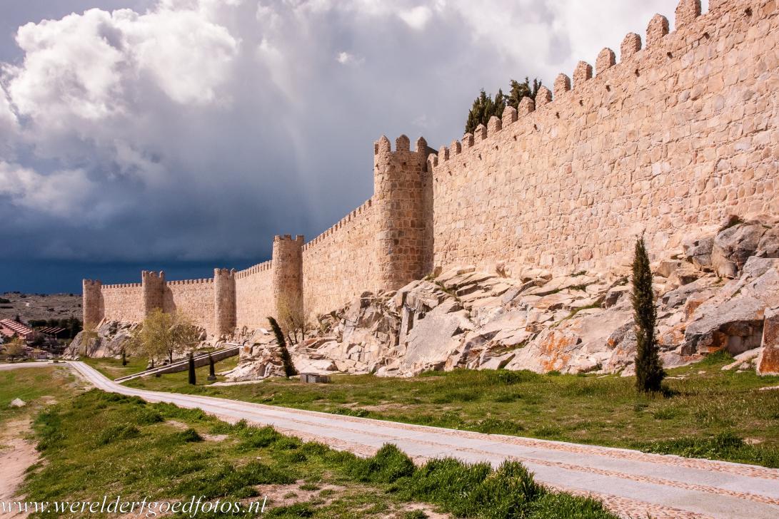Oude stad van Ávila met de kerken buiten de stadsmuren: De middeleeuwse muren omsluiten ook nu nog de hele historische stad van Ávila, de oudste delen dateren uit 1090. De muren van Ávila zijn circa 3 meter dik en 12 meter hoog, de omtrek is 2516 meter, ze hebben 88 halfronde torens en 9 poorten. Enkele gebouwen, zoals de kathedraal, maken deel uit van de muren van Ávila. De oude stad van Ávila met kerken buiten de muren is een Werelderfgoed van UNESCO.