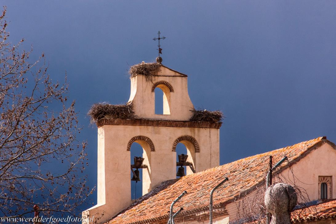 Oude stad van Ávila met de kerken buiten de muren: De Hermitage van de Santa María de la Cabeza met drie ooievaarsnesten op haar klokkentoren. De Ermita de Santa María de la Cabeza is een kerkje, dat buiten de muren van Ávila ligt. De bouw van de kerkje begon in de romaanse stijl, maar het schip werd in de mudéjarstijl gebouwd. De Santa María de la Cabeza werd gewijd in 1210. Het is een van de kerken, die buiten de stadsmuren van de Oude stad van Ávila staan.