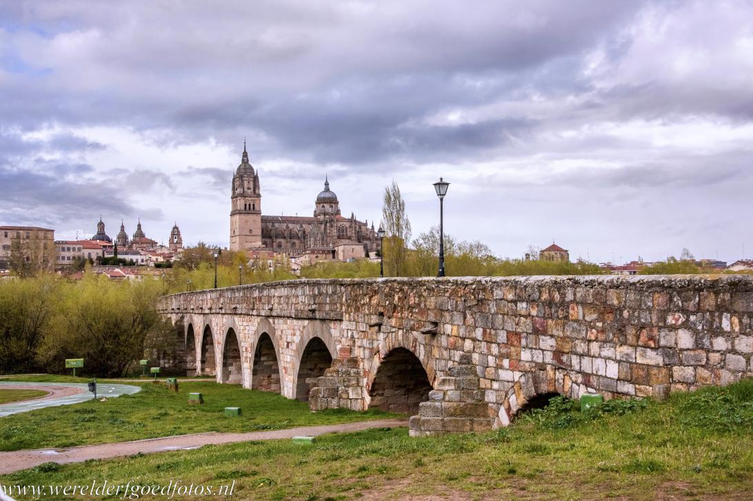 Oude stad van Salamanca: De Puente Mayor del Tormes, de brug over de rivier de Tormes, op de achtergrond de kathedraal van Salamanca, de brug staat ook bekend als de Romeinse brug, ze dateert uit de 1ste eeuw na Chr. en is een symbool van de stad. Salamanca is beroemd om haar universiteit. De Universiteit van Salamanca heeft grote invloed gehad op de historie van de stad. De Oude stad van Salamanca werd in 1998 een Werelderfgoed van UNESCO.
