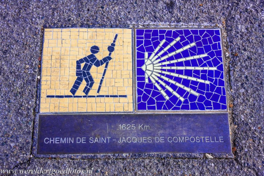 Pelgrimsroutes in Frankrijk naar Santiago de Compostela: Een mozaïektegel met het symbool van de route bij Chartres geeft de nog af te leggen afstand naar het einddoel aan, de kathedraal van Santiago de Compostela in Spanje. Eeuwenlang droegen pelgrims op weg naar Santiago de Compostela als herkeningsteken een sint-jakobsschelp op hun kleding. De sint-jacobsschelp is ook nu nog het symbool van de bedevaart naar Santiago de Compostela. De pelgrimsroutes in Frankrijk naar Santiago de Compostela kregen in 1998 de status Werelderfgoed van UNESCO.