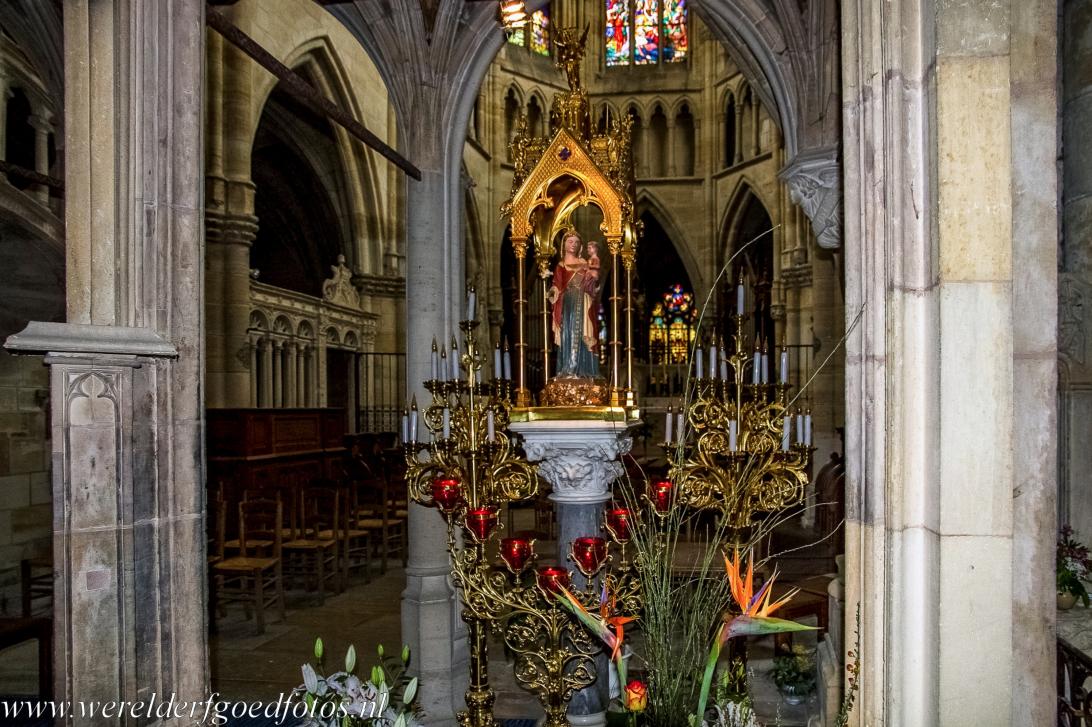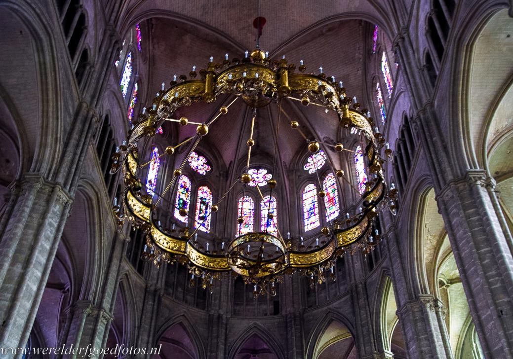 Pelgrimsroutes in Frankrijk naar Santiago de Compostela: De enorme kroonluchter hangt aan het gewelfde plafond van de kathedraal van Bourges, de gebrandschilderde ramen uit de 13de eeuw verlichten de kathedraal van Bourges met gekleurd licht. De kathedraal staat op de plek van een pelgrimsoord uit de derde eeuw, de kathedraal ligt aan de Via Lemovicensis, een van de vier hoofdroutes van de pelgrimsweg naar Santiago de Compostela. De Via Lemovicensis begint bij de basiliek Sainte-Marie-Madeleine in Vézelay.