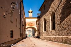 Historisch centrum van de stad Salzburg: De entree naar de vesting Hohensalzburg, een van de grootste nog bestaande 11de eeuwse forten in Europa. Salzburg was van de middeleeuwen tot de 19de eeuw een stadstaat, geregeerd door een prins-aartsbisschop, de Hohensalzburg was de zetel van de prins-aartsbisschop en het centrum van de politieke macht in de tijd, dat steden en staten door aartsbisschoppen werden geregeerd.