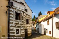 Historisch centrum van Český Krumlov: Een huis in de wijk Latrán gedecoreerd met renaissance sgraffiti. In het historisch centrum van Český Krumlov zijn veel huizen met muurschilderingen en renaissance sgraffiti gedecoreerd. Het historisch centrum is een doolhof van smalle steegjes, die geplaveid zijn met kasseien, de steegjes slingeren zich omhoog en weer omlaag tot aan de oever van de rivier de Vltava, de Moldau, die door de stad stroomt.