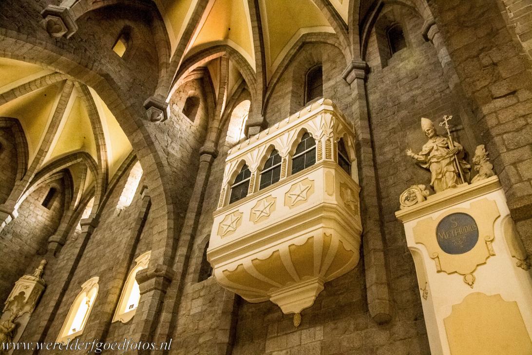 Joodse wijk en St. Procopius Basiliek in Trebíč: Een detail van het interieur van de St. Procopius Basiliek. Rond 1935 werden tijdens het verwijderen van enkele pleisterlagen de stenen muren uit de middeleeuwen ontdekt. De St. Procopius Basiliek is een unieke mengeling van romaanse en gotische architectuur. De basiliek ligt naast het kasteel van Třebíč.