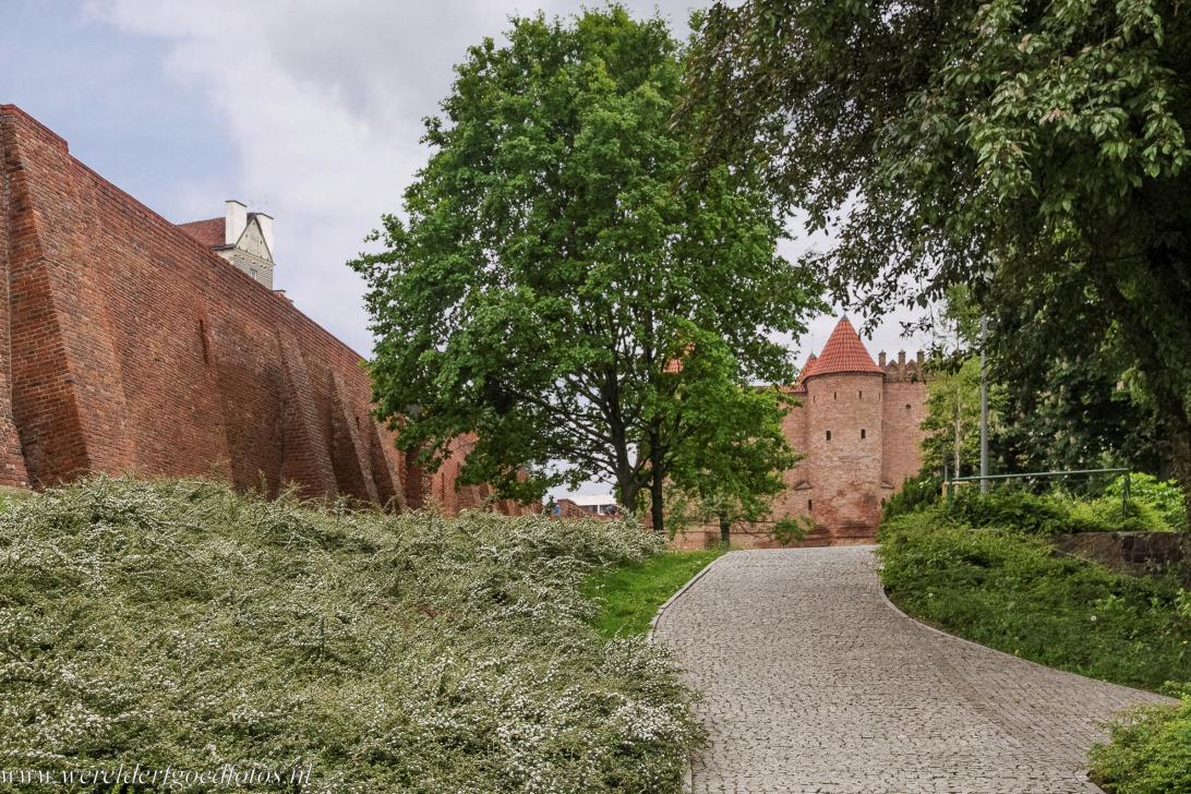 Historisch centrum van Warschau: Een van de torens van de Barbakan van Warschau. De toren werd gebouwd in 1540 op de locatie van een oudere poort. In 1656 deed de Barbican dienst bij de verdediging van Warschau. De vooruitgang in de militaire geschiedenis maakte de Barbican daarna overbodig. In de 18de eeuw werd ze gedeeltelijk afgebroken. De 16de eeuwse Barbakan van Warschau is de op een na grootste van Polen. De grootste is de Barbakan van Kraków.
