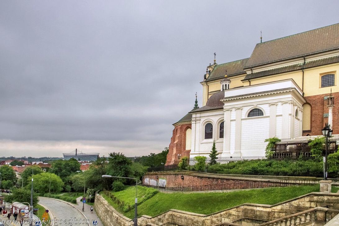 Historisch centrum van Warschau: Het Nationaal Stadion gezien vanuit het historisch centrum van Warschau. Het Stadion Narodowy werd gebouwd voor de UEFA Euro 2012, het Europese Voetbalkampioenschap in 2012. Rechts staat de Sint-Annakerk, een van de oudste gebouwen in Warschau. De Sint-Annakerk werd tijdens een Duitse luchtaanval in 1939 licht beschadigd, na de Opstand van Warschau in 1944 werd het dak door nazi-troepen als vergeldingsactie opgeblazen.
