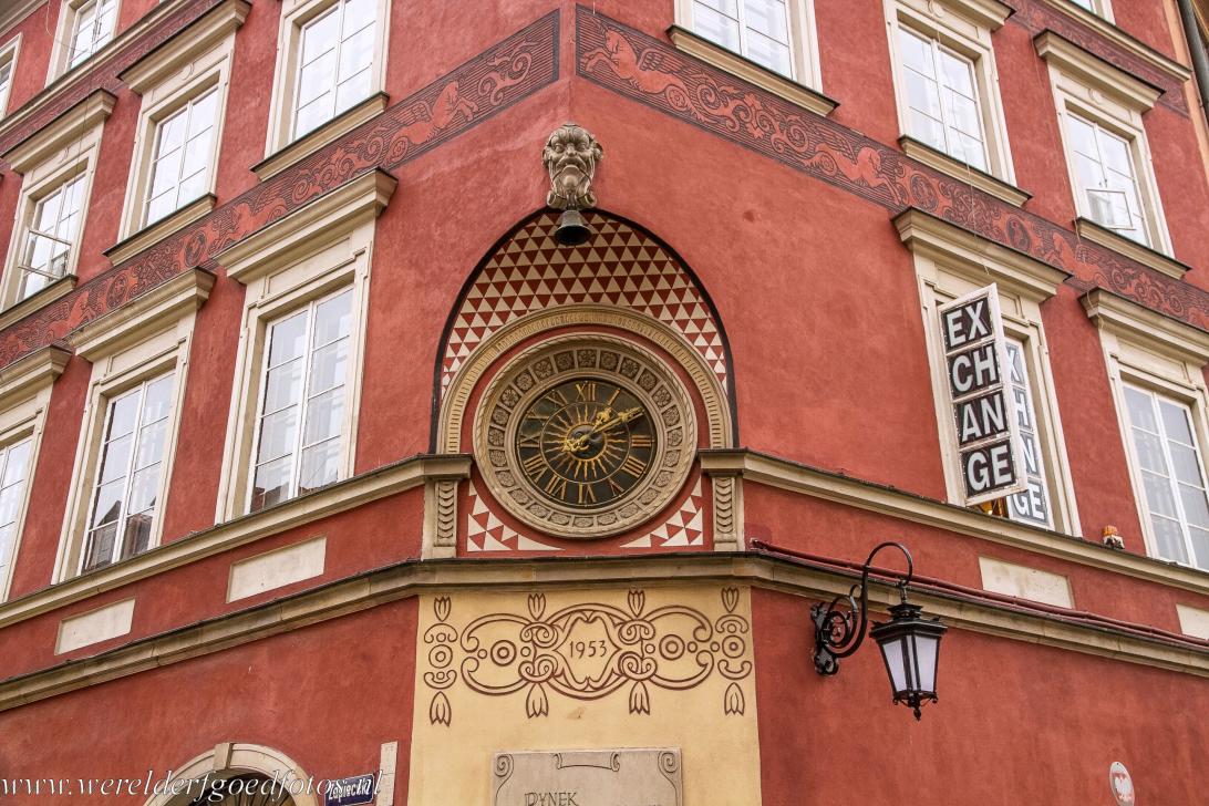 Historisch centrum van Warschau: Een gedecoreerde klok op het Simonetti Huis. Het Simonetti Huis staat op een hoek van het marktplein, de Rynek Starego Miasta. De datum op de plaquette onder de klok is ter herinnering aan de herbouw van het historisch centrum van Warschau, dat in WOII bijna compleet verwoest werd. Tussen 1950 en 1970 werd het historische centrum van Warschau herbouwd door Polen, met de steun van de voormalige Sovjet-Unie.