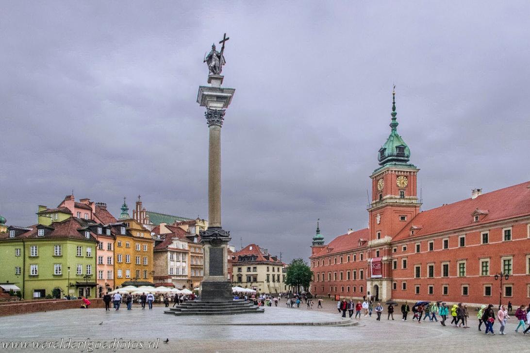 Historisch centrum van Warschau: Donkere wolken hangen boven Plac Zamkowy, het Slotplein in het centrum, met de Sigismundzuil en het Koninklijk Paleis. De Sigismundzuil werd opgericht ter ere van de Poolse koning Sigimund III Vasa, die in 1596 de hoofdstad van Polen van Kraków naar de stad Warschau liet verplaatsen. De Sigismundzuil is een van de bekendste en oudste monumenten van Warsschau. De zuil is een beroemd ontmoetingspunt in de historische stad.