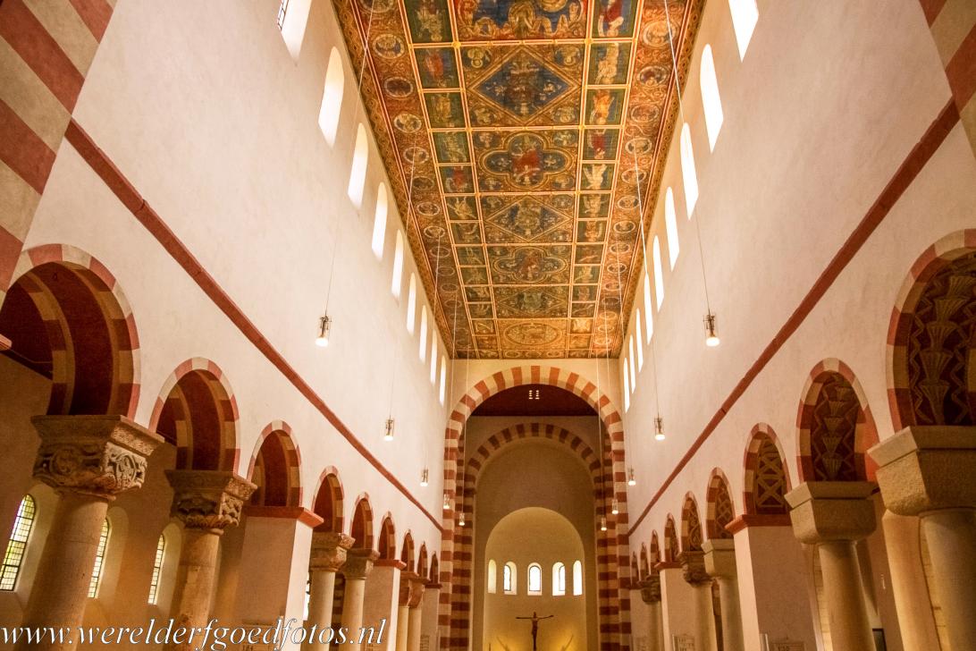 De Michaëlskerk in Hildesheim: Het 13de-eeuwse beschilderde houten plafond boven het schip. Het schip wordt gedragen door twaalf ronde zuilen en vier vierkante pijlers, ze verwijzen naar de twaalf apostelen van Jezus en de vier evangelisten. De plattegrond van de Michaëlskerk bestaat uit drie maal drie vierkanten; het getal drie staat voor de Heilige Drie-eenheid. Dit is slechts één van de vele voorbeelden van getallensymboliek die door de hele kerk zijn te vinden.
