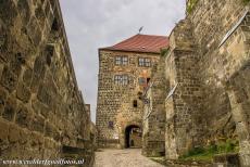 Stiftskerk van Sint Servaas, kasteel en historisch centrum van Quedlinburg: De massieve poort naar het kasteel van Quedlinburg op de Schloßberg, de Slotberg. Aan de voet van de Schloßberg bevindt zich de Lyonel Feininger Gallerie. De gallerie presenteert het werk van Lyonel Feininger (1871-1956), een Duits-Amerikaans tekenaar, graficus, fotograaf en schilder, hij was een van de eerste docenen aan de kunstschool het Bauhaus in Weimar.