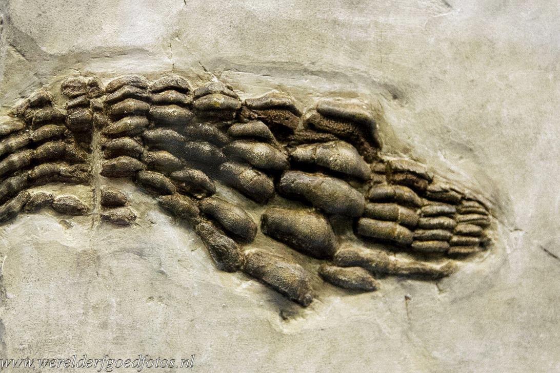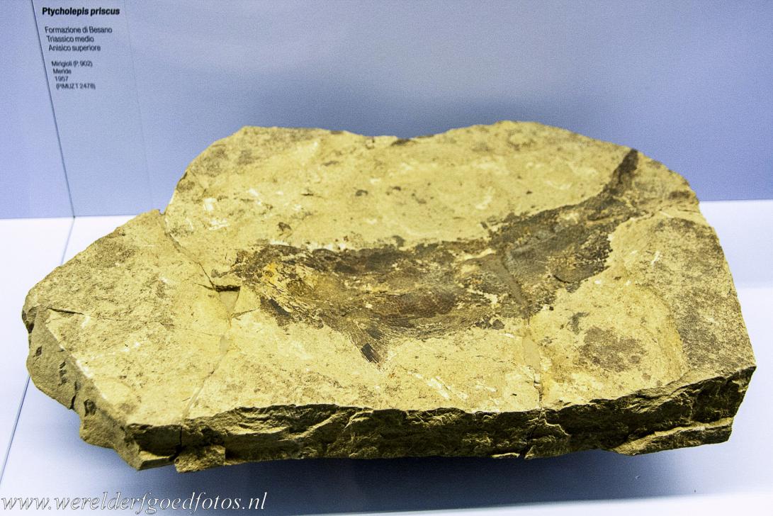Monte San Giorgio: Een fossiel van een Ptycholepsis priscus, een primitieve straalvinnige vis. Het fossiel werd gevonden in de Italiaanse Besano formatie. De fossielen op de Monte San Giorgio werden ontdekt tijdens de winning van oliehoudende leisteen, de deposito's van de Monte San Giorgio bevatten voornamelijk zeedieren, zoals vissen en zeereptielen.