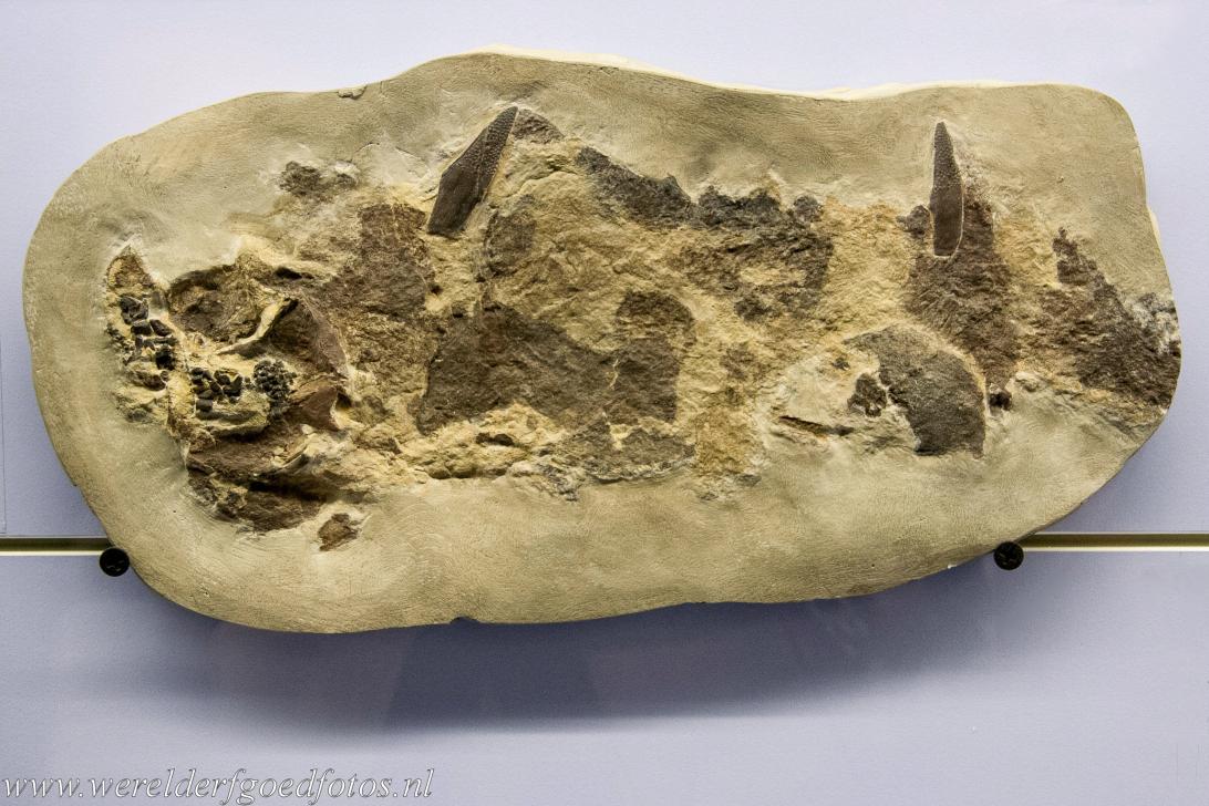 Monte San Giorgio: Een fossiel van de Acrodus georgii, het fossiel werd gevonden in de Besano formatie van Lombardije in Italië. Op de berg Monte San Giorgio, een voormalige subtropische lagune, werden niet alleen zeefossielen gevonden, maar eveneens enkele fossielen van op het land voorkomende insecten, reptielen en planten.