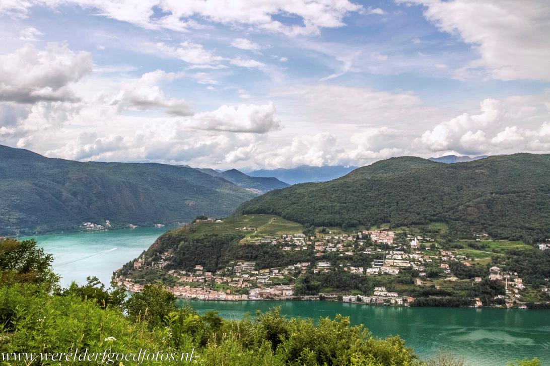 Monte San Giorgio: Het uitzicht over het meer van Lugano vanaf de Monte San Giorgio, een met bossen begroeide berg in de Alpen, in het zuiden van Zwitserland dichtbij de grens met Italië. De berg heeft een grote wetenschappelijke, archeologische en historische waarde, in de rotsen van de berg werden grote hoeveelheden fossielen van 243 tot 239 miljoen jaar geleden ontdekt.