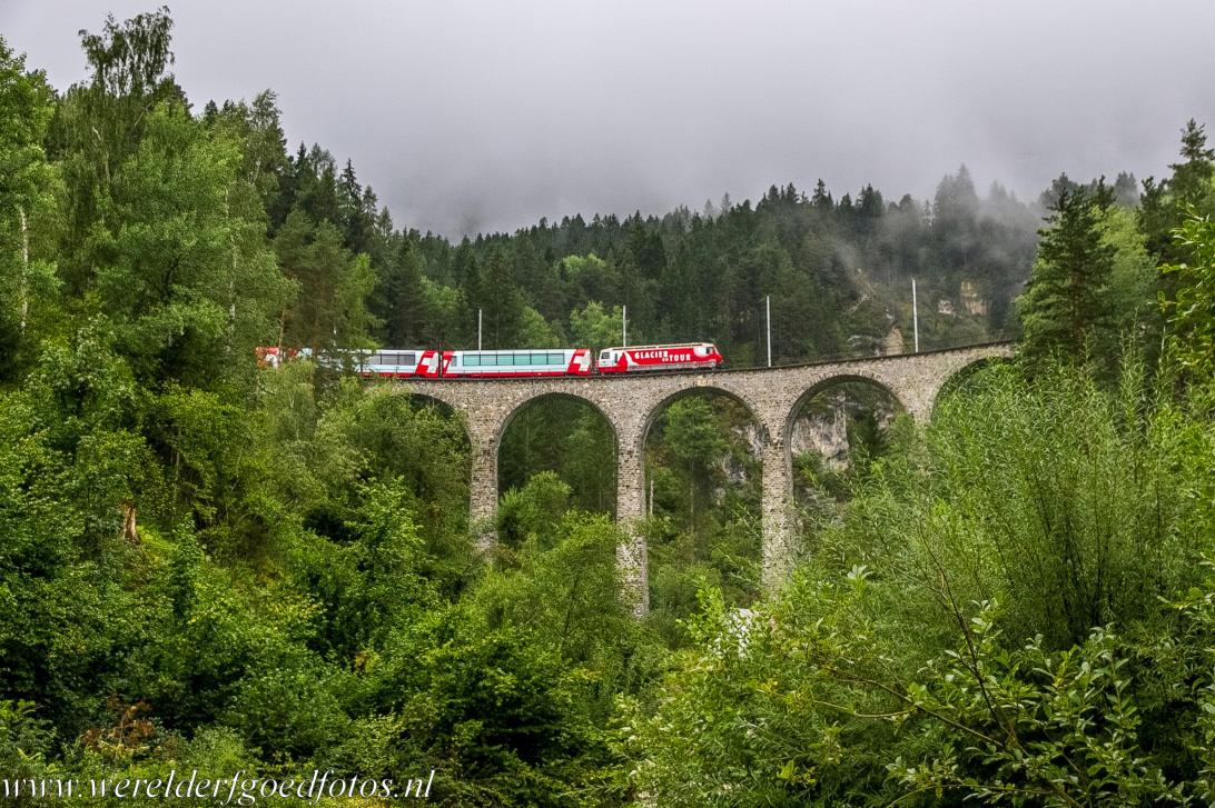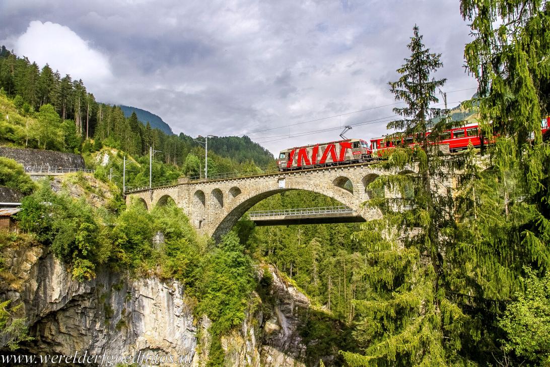 Rhätische Bahn in het Albula / Bernina landschap: De beroemde Glacier Express passeert het Schmittentobelviaduct bij het dorp Filisur. Het Schmittentobelviaduct is 36 meter hoog en 120 meter lang, het viaduct ligt op het traject van de Albulaspoorlijn tussen de dorpen Tiefencastel en Filisur. De Rhätische Bahn in het Albula / Bernina landschap werd in 2008 uitgeroepen tot Werelderfgoed van UNESCO.