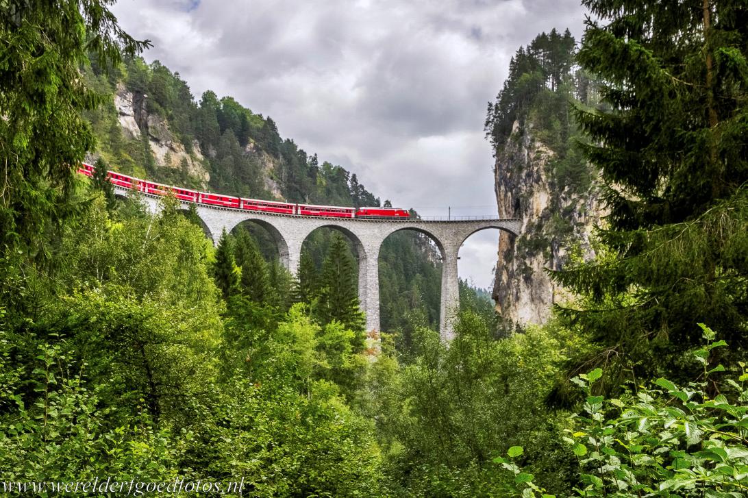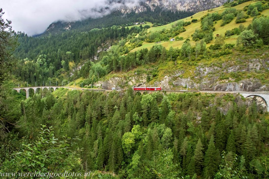Rhätische Bahn in het Albula / Bernina landschap: Een rode trein nadert de tunnel tussen het 36 meter hoge Schmittentobelviaduct en 65 meter hoge Landwasserviaduct. De Albulalijn passeert 55 bruggen, 39 tunnels en klimt ruim 1000 meter omhoog in het berglandschap van de Alpen. De treinen van de Rhätische Bahn zijn bijna allemaal rood van kleur, de spoorwegmaatschappij kreeg daarom haar bijnaam 'Die Kleine Rote', de Kleine Rode.