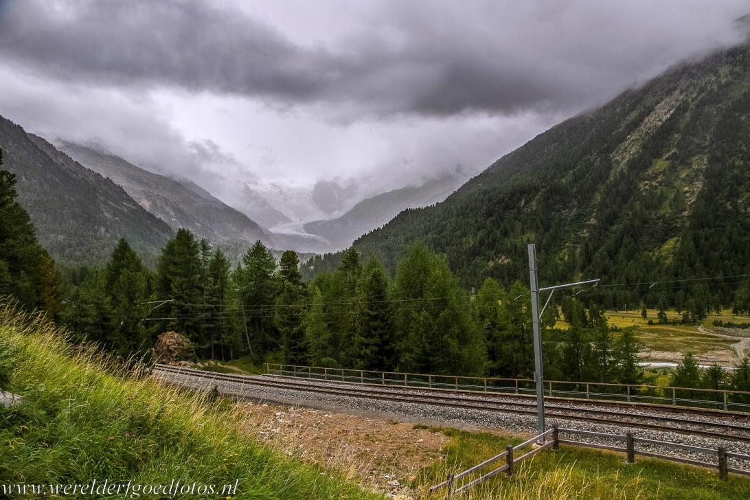 Rhätische Bahn in het Albula / Bernina landschap: De Montebello Curve waar de Berninalijn de weg over de Berninapas kruist, op de achterground ligt de indrukwekkende Morteratschgletsjer met het Berninamassief. De 61 km lange Berninaspoorlijn verbindt Chur, Davos en St. Moritz in Zwitserland met de stad Tirano in Italië via de Berninapas.