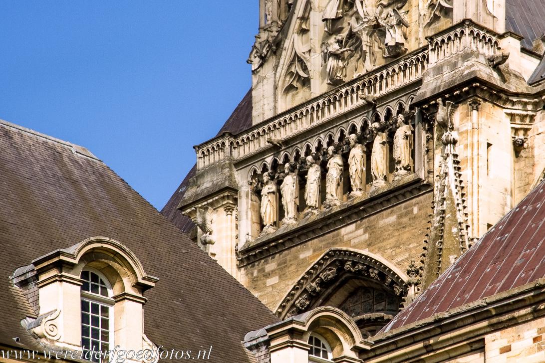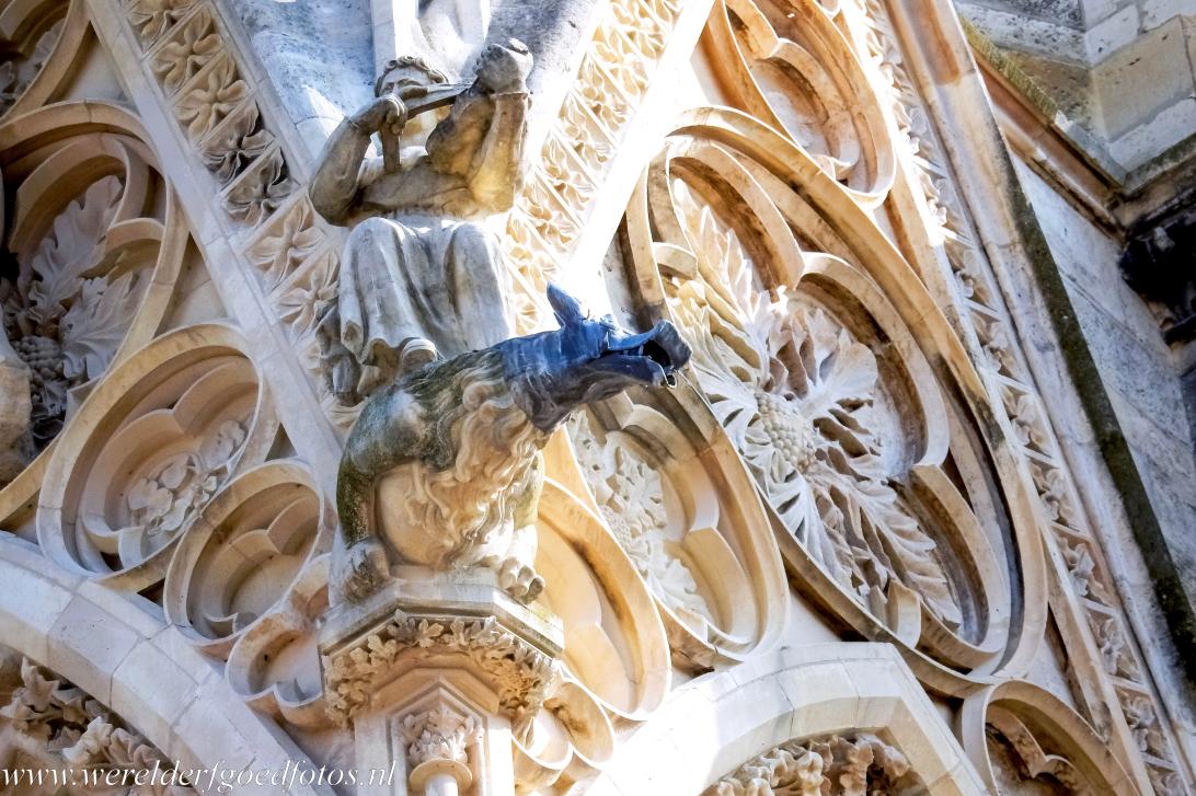 De Notre-Dame, de Onze Lieve-Vrouwekathedraal in Reims: Een standbeeld van een engel, die met een muziekinstrument op een waterspuwer zit. De kathedraal van Reims is verfraaid met 2303 sculpturen. De westfaçade is een waar meesterwerk van vakmanschap en middeleeuwse kunst. De portalen van de kathedraal zijn de grootste gotische portalen ter wereld. De portalen zijn overvloedig gedecoreerd met beeldhouwwerken uit de 13de eeuw.