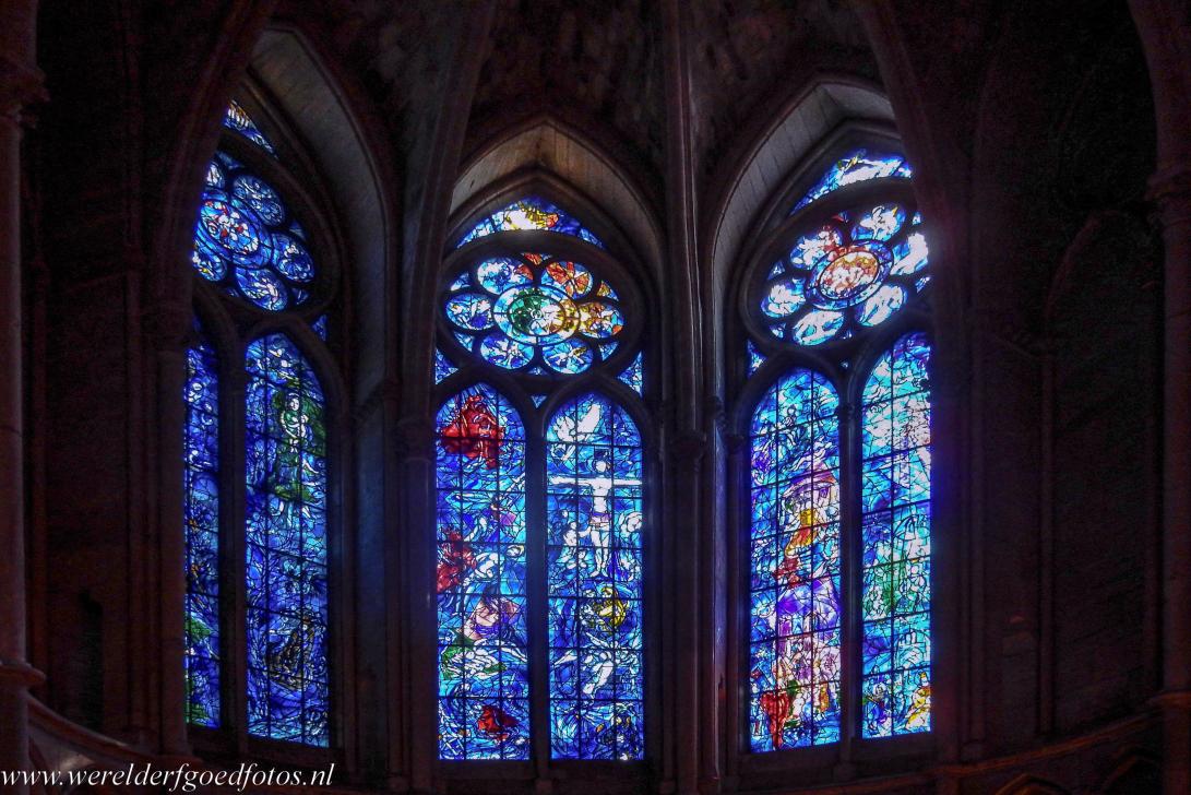 De Notre-Dame, de Onze Lieve-Vrouwekathedraal in Reims: De Wit-Russische-Franse beeldend kunstenaar Marc Chagall ontwierp de drie gebrandschilderde glas-in-lood ramen voor de Axiale Kapel van de kathedraal van Reims. De ramen werden in 1974 gemaakt door Charles Marq en zijn vrouw Brigitte Simon. Charles Marq paste de speciale middeleeuwse techniek toe, die werd gebruikt in het 13de eeuwse Reims voor de productie van de intense blauwe kleur, die ook werd gebruikt voor de ramen van de kathedraal in Chartres, bekend als 'Chartres Blauw'.