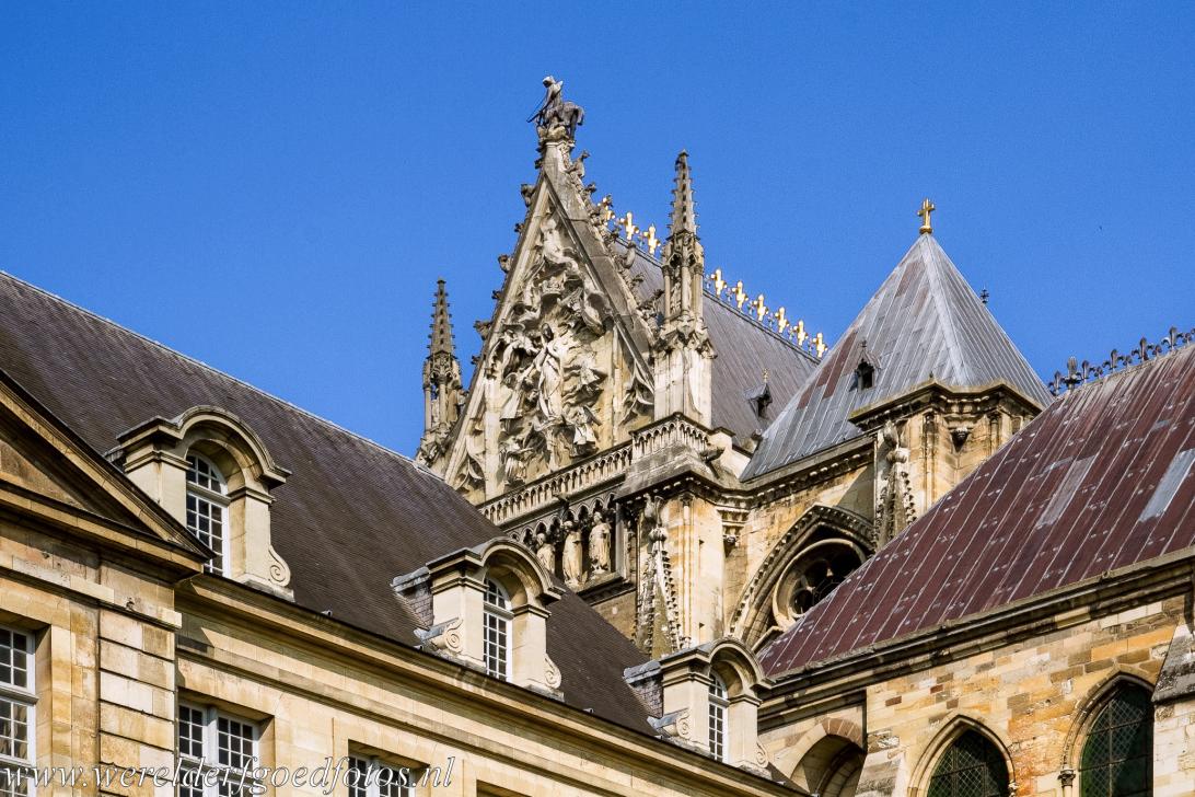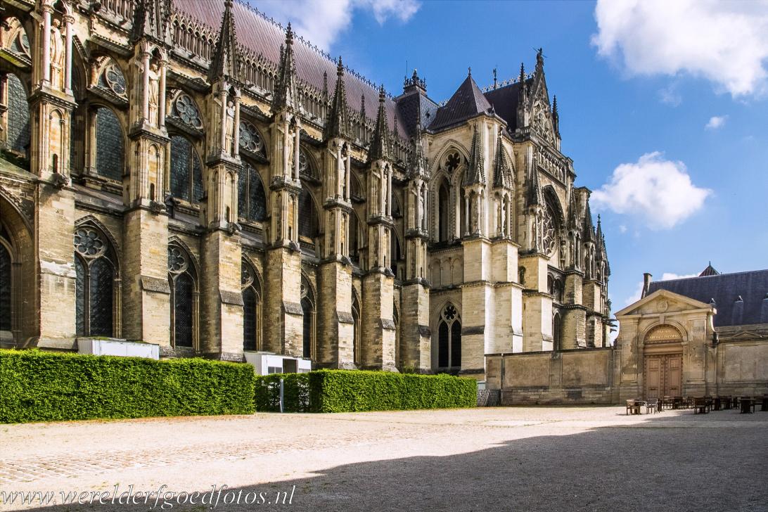 Notre-Dame Kathedraal, het voormalige klooster van Saint-Rémi en Paleis van Tau in Reims: De Notre-Dame kathedraal (Onze-Lieve-Vrouwekathedraal) in Reims staat bekend als de kathedraal van Reims. Reims is de hoofdstad van de Champagnestreek, de stad ligt ten noordoosten van Parijs in Frankrijk. In de kathedraal van Reims werden drieëndertig Franse koningen gekroond, van Lodewijk VIII in 1223 tot Karel X in 1825, het bekendst is de kroning van Karel VII in 1429 in aanwezigheid van Jeanne d'Arc, de Maagd van Orléans. De bouw van de huidige kathedraal begon in 1211, de kathedraal van Chartres stond model. De hoofdconstructie van de kathedraal van Reims duurde ongeveer 80 jaar, maar de uitbreidingen en decoratie duurde enkele eeuwen. Rond 1290 werd een labyrint in de vloer van het schip ingelegd, het labyrint van Reims werd in 1779 verwoest, de details en inscripties zijn bekend uit 18de eeuwse tekeningen. De kathedraal van Reims behoort samen met de kathedralen van Bourges, Amiens en Chartres, tot de Frans gotische of hooggotische kathedralen. Tijdens de Eerste Wereldoorlog werd de kathedraal door Duits artillerievuur en de daarop volgende hevige brand ernstig beschadigd, ondanks dat de beroemde Lachende Engel van de kathedraal was beschadigd, werd ze het icoon van de Franse oorlogspropaganda. De restauratie van de kathedraal begon kort na de oorlog en duurt tot op heden voort. De kathedraal liep lichte schade op tijdens de Tweede Wereldoorlog. In 1962 vond in de kathedraal van Reims de verzoening tussen Duitsland en Frankrijk plaats, er werd een mis voor de vrede gehouden in het bijzijn van president Charles de Gaulle en kanselier Konrad Adenauer. De kathedraal ligt aan de Via Campaniensis, een tak van de pelgrimsroute naar de Spaanse stad Santiago de Compostela. De Notre-Dame Kathedraal in Reims werd, samen met het voormalige klooster van Saint-Rémi en het Paleis van Tau in Reims, in 1991 uitgeroepen tot een Werelderfgoed van UNESCO, het staat vermeld op de Werelderfgoedlijst van UNESCO als: Cathedral of Notre-Dame, former Abbey of Saint-Rémi and Palace of Tau, Reims.