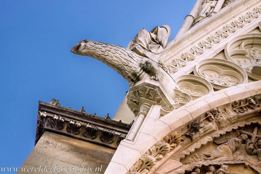 Kathedraal Notre-Dame, voormalig klooster van Saint-Rémi en Paleis van Tau in Reims: Een van de waterspuwers van de kathedraal van Reims. De bouw van de kathedraal duurde ongeveer 80 jaar, maar de uitbreidingen en het decoreren namen enkele eeuwen in belsag. De kathedraal is verfraaid met talrijke beelden van engelen, daarom staat ze ook wel bekend als 'Cathédrale des Anges', 'Kathedraal van de Engelen'.