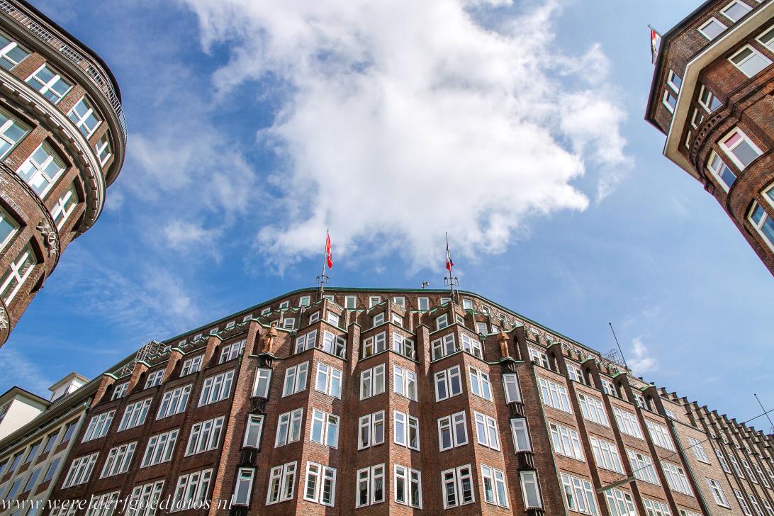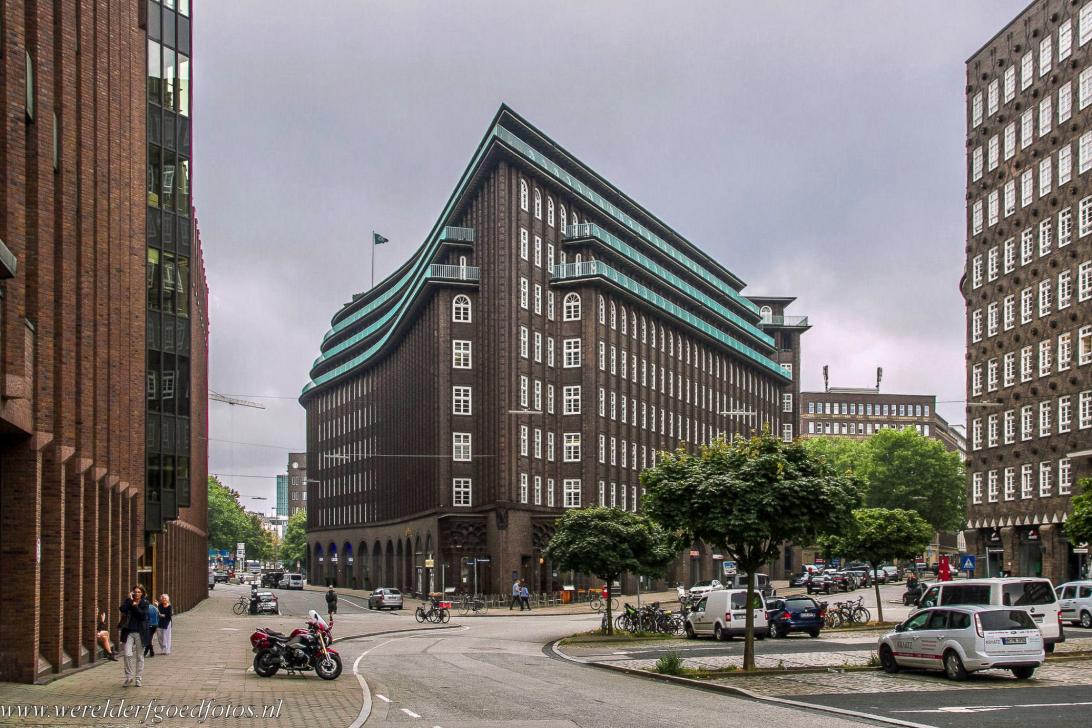 Speicherstadt en Kontorhaus-district met het Chilehaus in Hamburg: De Speicherstadt is de grootste wijk met pakhuizen ter wereld, het ligt in de haven van Hamburg. Hanzestad Hamburg ligt in het noorden van Duitsland aan de oevers van de rivier de Elbe. De haven van Hamburg ligt 110 km landinwaarts. Door de diepte van de Elbe is het mogelijk dat grote oceaanschepen vanaf de Noorzee de haven van Hamburg kunnen bereiken. Bij Hamburg is de Elbe bijna drie kilometer breed. De haven van Hamburg is de op twee na grootste haven van Europa; alleen de havens van Rotterdam en Antwerpen zijn groter. De Speicherstadt werd tussen 1885 en 1927 gebouwd op enkele eilandjes in de Elbe. De pakhuizen van de Speicherstadt zijn gebouwd op eikenhouten palen; de gebouwen hebben meerdere verdiepingen en zijn opgetrokken uit rode baksteen, verfraaid met torentjes, nissen en geglazuurde terracotta ornamenten. De pakhuizen zijn bereikbaar vanaf het land en het water. De Speicherstadt is een waar netwerk van wegen en kanalen. De Speicherstadt werd gebouwd voor de overslag van goederen, zonder betaling van havenbelasting. In de Tweede Wereldoorlog werd de Speicherstadt tijdens hevige geallieerde bombardementen voor de helft verwoest. De gedeeltelijke wederopbouw vond plaats tussen 1949 en 1967. In de Speicherstadt werden producten zoals cacao, koffie, thee, specerijen en tabak opgeslagen en verhandeld. Tegenwoordig bieden enkele pakhuizen onderdak aan musea; het Haus der Photographie Hamburg is gehuisvest in de Deichtorhallen, het Internationales Maritimes Museum Hamburg is ondergebracht in Kaispeicher B, het oudste nog bestaande pakhuis van de Speicherstadt. Naast de Speicherstadt ligt het Kontorhausviertel, een stadswijk met bakstenen Kontorhäuser, de kantoorgebouwen van de kooplieden. Het bekendst is het Chilehaus, een prachtig voorbeeld van de modernistische architectuur van rond 1920. Het Kontorhausviertel getuigt van de welvaart van de voormalige handelsfirma's in Hamburg. De Speicherstadt en Kontorhaus-district met het Chilehaus werden in 2015 ingeschreven op de Werelderfgoedlijst van UNESCO als: Speicherstadt and Kontorhaus District with Chilehaus.