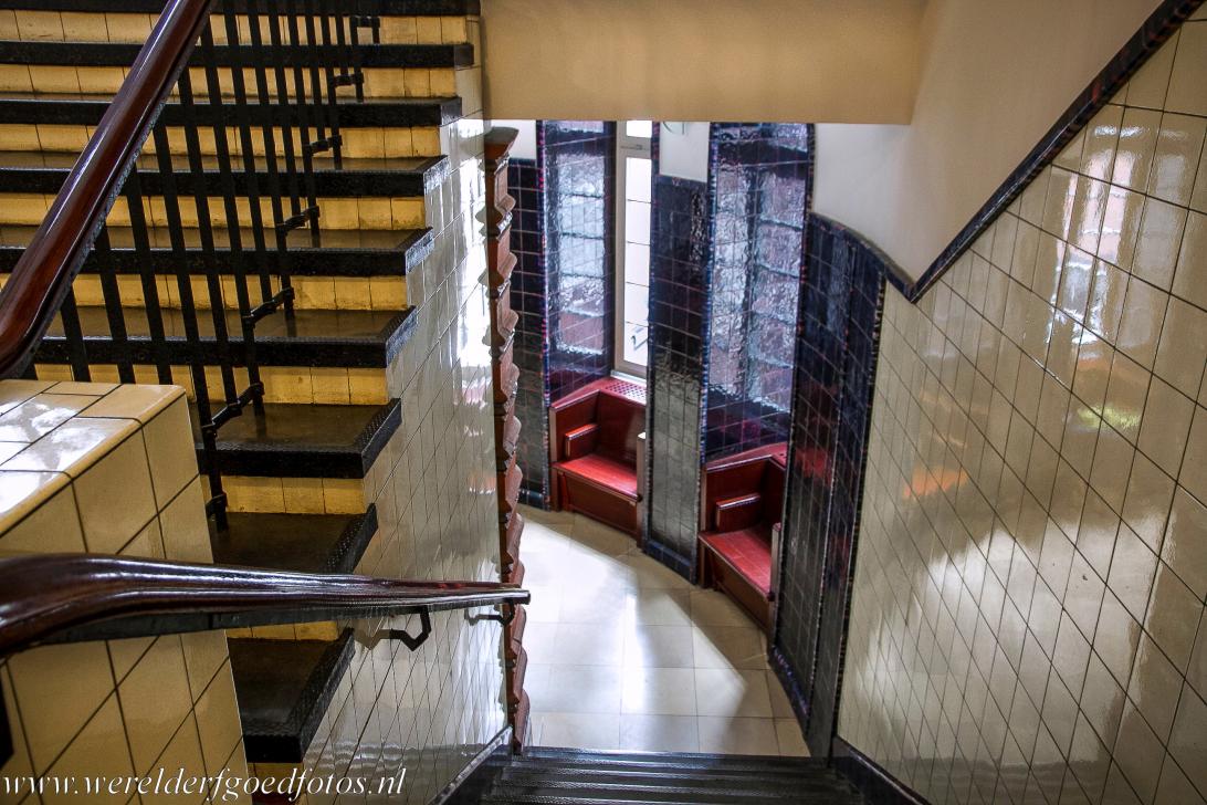 Speicherstadt en Kontorhaus-district met het Chilehaus in Hamburg: Het trappenhuis van het Chilehaus is een waar meesterwerk van de Art Deco. Het is gedecoreerd met handgemaakte keramische tegels en vergulde elementen. Het Chilehaus is het grootste kantoorgebouw in het Kontorhaus-district, waar de Kontorhäuser van de kooplieden werden gebouwd. Het Chilehaus is het bekendste gebouw in deze stadswijk en het bekendste werk van de architect Fritz Höger.
