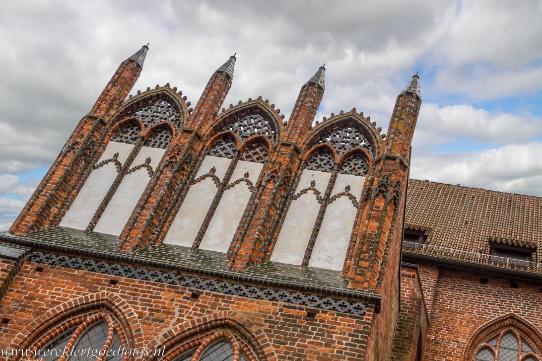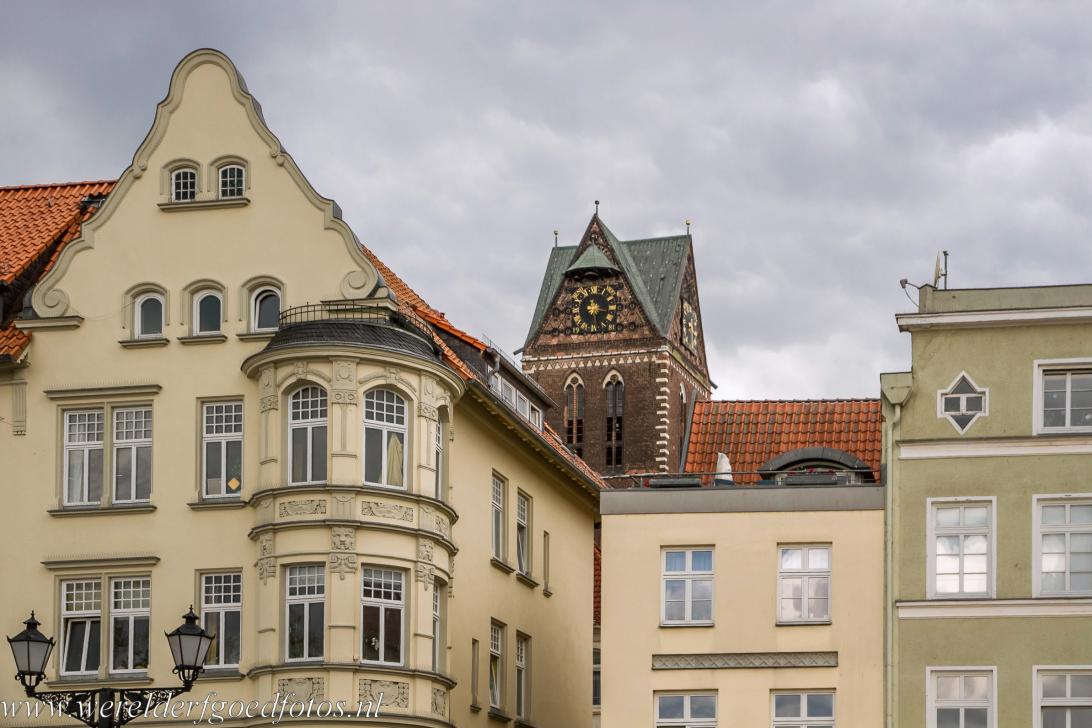 Historisch stadscentrum van Wismar: De toren van de St. Marienkirche rijst hoog boven Wismar uit. De kerk werd in de 13de eeuw gebouwd door de kooplieden van Wismar; ze werd tijdens de Tweede Wereldoorlog beschadigd en opzettelijk verwoest tijdens de DDR-periode. De 80 meter hoge toren is het enige overgebleven deel van de oorspronkelijke gotische kerk. Ooit werd de Marienkirche beschouwd als een van de mooiste baksteengotische kerken in Noord-Duitsland.