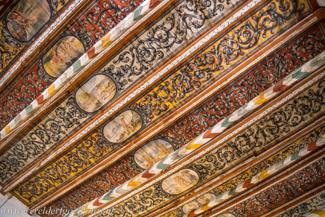 Historisch stadscentrum van Wismar: Het decoratieve plafond van de kerk van de Heilige Geest. Het vlakke plafond werd gebouwd en beschilderd in de 17de eeuw. Het is gedecoreerd met 26 rozetten waarop afbeeldingen van Bijbelse verhalen staan; de massieve houten balken zijn in de traditionele Baltische motieven en kleuren geschilderd. De kerk van de Heilige Geest diende als ziekenhuis en kerk. De bedden voor de zieken en armen stonden in het schip van de kerk.
