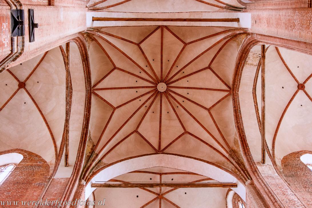 Historisch stadscentrum van Wismar: De gewelven van de St. Joriskerk zijn verfraaid met rode baksteen. De St. Joriskerk is een van de drie belangrijkste kerken van Wismar; ze werd gebouwd in de 13de eeuw en is een mooi voorbeeld van de gotische baksteenarchitectuur in het noorden van Duitsland. De enorm hoge gewelven zijn indrukwekkend. De kerk werd tijdens de Tweede Wereldoorlog zwaar beschadigd; pas na de Duitse hereniging in 1990 begon de restauratie.