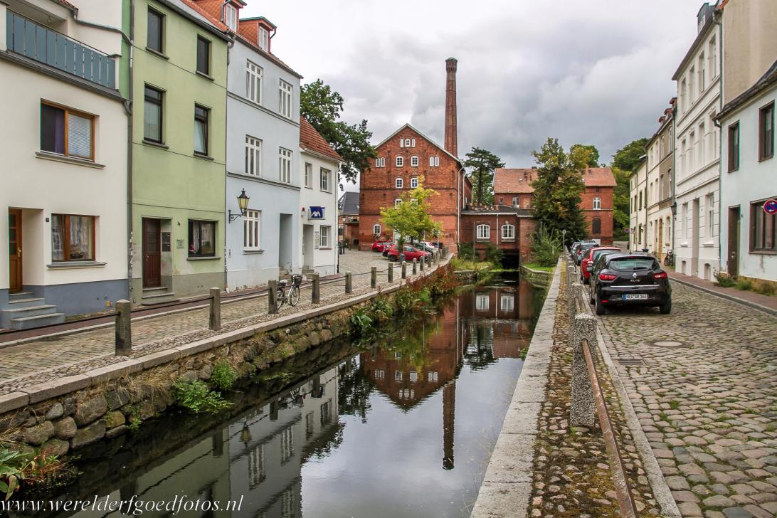 Historisch stadscentrum van Wismar: De oude stadsmolen op de oever van de Mühlenbach, een sectie van de Grube. De Grube is een smalle, met de hand gegraven beek in Wismar. Ze werd in de 13de eeuw aangelegd om goederen van de Hanzehaven naar de stad te vervoeren. De Grube is verdeeld in drie secties: de Mühlenbach, de Frische Grube en Runde Grube. De Grube leverde ook het water om de waterraderen en molenstenen van fabrieken aan te drijven.