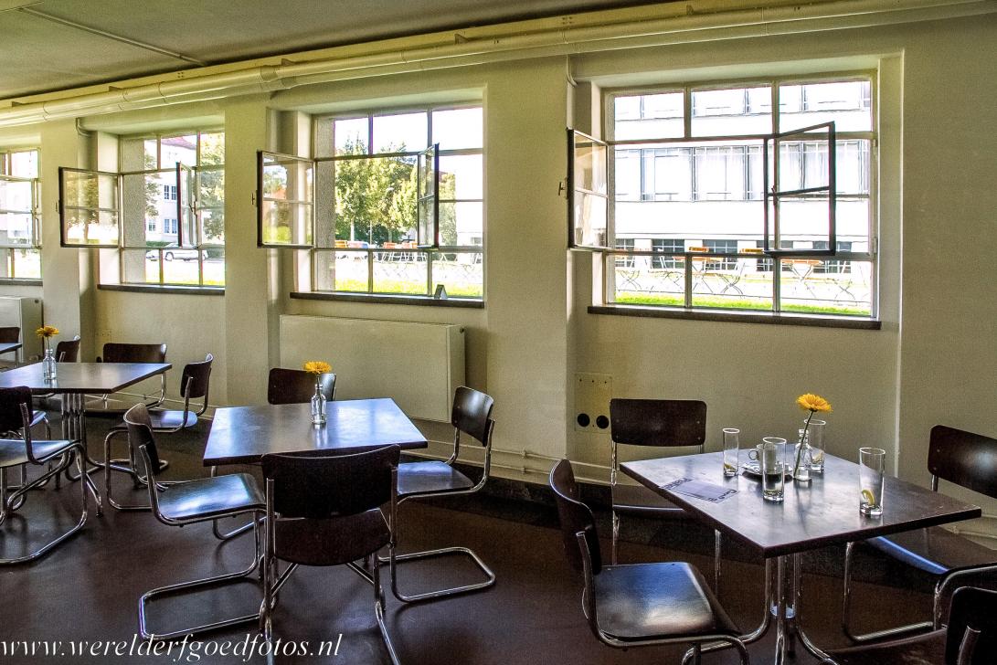 Het Bauhaus in Dessau: Cafe-Bistro im Bauhaus in het hoofdgebouw van de Bauhaus School in Dessau. Zowel de opleiding als het gebouw waarin de school gevestigd was, heet het Bauhaus. Met de opkomst van het nationaalsocialisme werd het Bauhaus in 1933 verplicht opgeheven, de docenten en leerlingen verspreidden zich over de hele wereld. Walter Gropius werd hoogleraar aan de Harvard Universiteit in de U.S.A.