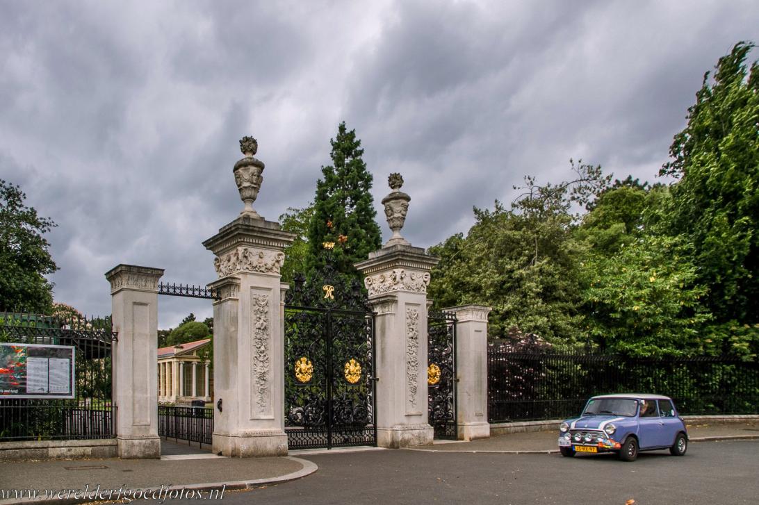 Koninklijke Botanische Tuinen van Kew in Londen: Onze classic Mini voor de hoofdpoort van Kew Gardens, de poort werd gebouwd in 1848 en is de noordelijke ingang van Kew Gardens. In 2012 werd de poort omgedoopt tot Elizabeth Gate om het diamanten regeringsjubileum van de Britse koningin Elizabeth II te herdenken, direct achter de poort ligt het Nash Conservatory.