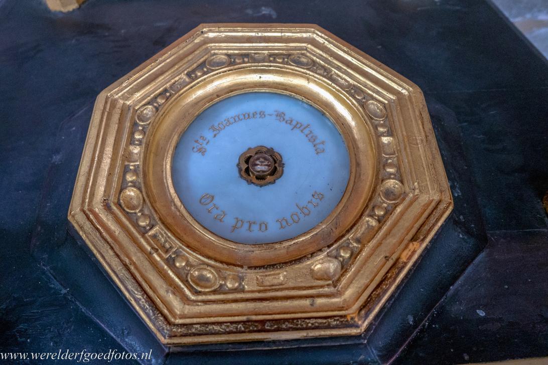 Kathedraal van Amiens: Een fragment van de schedel van Johannes de Doper, de Voorloper van Jezus Christus. De reliekschrijn, die het christelijke relikwie bevat, is een 19de-eeuwse kopie van het middeleeuwse origineel. Het christelijke relikwie werd tijdens de Vierde Kruistocht door een Franse kruisvaarder ontdekt en in 1206 naar Amiens gebracht, sindsdien is de kathedraal door dit religieuze relikwie uitgegroeid tot een belangrijk christelijk bedevaartsoord.