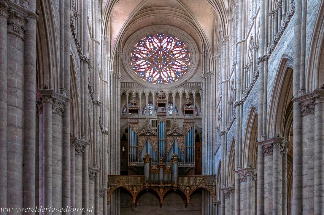 Kathedraal van Amiens: Het middenschip richting het orgel en het roosvenster in de westelijke façade. Het orgel van de kathedraal dateert uit 1422, het werd omstreeks 1549 omgebouwd in renaissancestijl en werd omstreeks 1766 uitgebreid. Het hoog gotische roosvenster dateert uit 1221- 1230. In 1803 bracht Napoleon Bonaparte een bezoek aan de kathedraal van Amiens, hij werd getroffen door de grootsheid en schoonheid van de kathedraal.